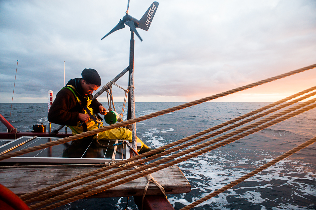 homme réparant une éolienne à bord du tres hombres. Le bateau possède des batteries et tire son énergie du soleil etdu vent.